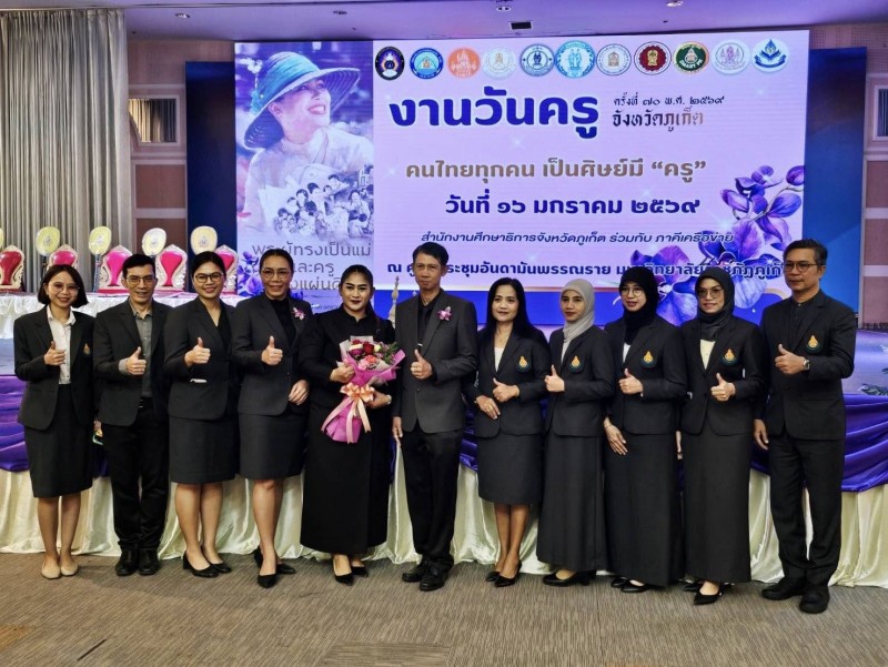 นายโอภาส คงยศ ผู้อำนวยการโรงเรียนบ้านอ่าวน้ำบ่อ นางสาว กัญญารัตน์ วิจาราณ์ รองผู้อำนวยการโรงเรียนบ้านอ่าวน้ำบ่อ และคณะครูเข้าร่วมงานวันครูจังหวัดภูเก็ต ครั้งที่ 70 ประจำปี 2569 เพื่อร่วมแสดงความยินดีกับนางสาวเจษฎารัตน์ สังข์ศิลป์ชัยที่ได้รับรางวัลครูดีศรีภูเก็ต ประจำปี 2568 ณ ศูนย์ประชุมอันดามันพรรณราย มหาวิทยาลัยราชภัฎภูเก็ต เมื่อวันที่ 16 มกราคม พ.ศ. 2569 (ภาพครูอรพิณ/ข่าวครูต้นไม้) |