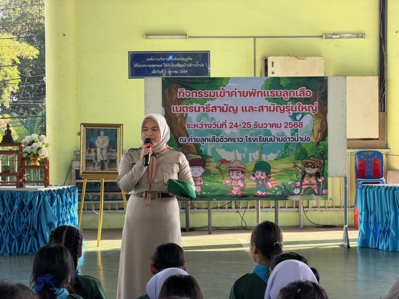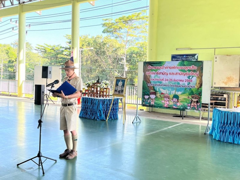 นายโอภาส คงยศ ผู้อำนวยการค่ายลูกเสือชั่วคราวโรงเรียนบ้านอ่าวน้ำบ่อ และประธานเปิดกองลูกเสือ-เนตรนารี สามัญ กองลูกเสือ-เนตรนารี สามัญรุ่นใหญ่ ระดับชั้นป.4-ม.3 ประ จำปีการศึกษา 2568 โดยมีนางสาวอรุณี อิสระโชติ ผู้กำกับกองลูกเสือสามัญโรงเรียนบ้านอ่าวน้ำบ่อ ผู้รับผิดชอบกิจกรรมการเข้าค่ายลูกเสือครั้งนี้ ได้กล่าวรายงานการจัดกิจกรรมเข้าค่ายลูกเสือ ฝึกอบรมพัฒนาเยาวชนให้เป็นพลเมืองดี โดยไม่คำนึงถึงเชื้อชาติ ศาสนาสมรรถภาพของบุคคลทั้งทางสมอง ร่างกาย จิตใจ และศีลธรรม เพื่อให้เป็นบุคคลที่มีความประพฤติดีงาม ไม่กระทำตนให้เป็นปัญหาต่อสังคม และดำรงชีวิตอย่างมีความหมาย และสุขสบาย ซึ่งมีกิจกรรมได้แก่ ฐานการผจญภัย เดินทางไกล ฐานลำเลียงน้ำ กิจกรรมทักษะลูกเสือ ฐานบุกเบิก ฐานปฐมพยาบาล เป็นต้น